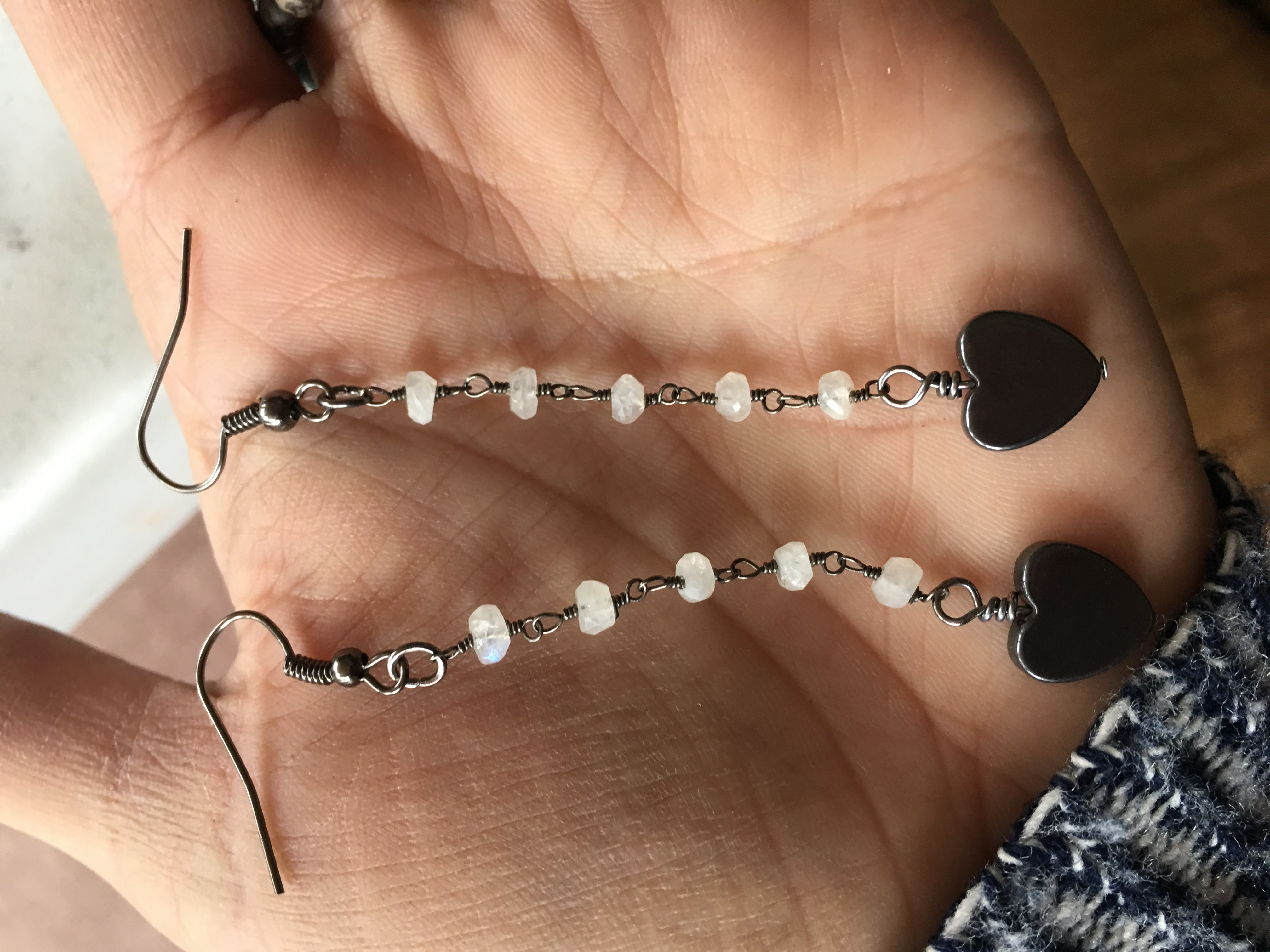 This pair of earrings embraces the concept of Beltane and the essence of fertility. Moonstone is linked to intuition, the heart, emotions, and fertility. Moonstone helps us release energy blockages and end painful repetitive cycles. It is known as a luck stone that can soothe the emotions. Through the pineal gland, Moonstone is able to help balance hormonal cycles, especially in women. (See more below) Hematite is a healing stone that brings strength, personal magnetism, and courage. Hematite can strengthen one's will while reminding us of desires forgotten. Hematite is very beneficial for math and working with numbers, and enhances intellect in general. Hematite helps anemia because it simulates the body's absorption of iron and increases oxygen supply to the brain. My favorite thing about the Hematite heart is that it encourages love and the ability we each have to better the human condition. Together, Moonstone and Hematite can keep us calm but confident - sure of ourselves while also keeping the wellbeing of others in mind.