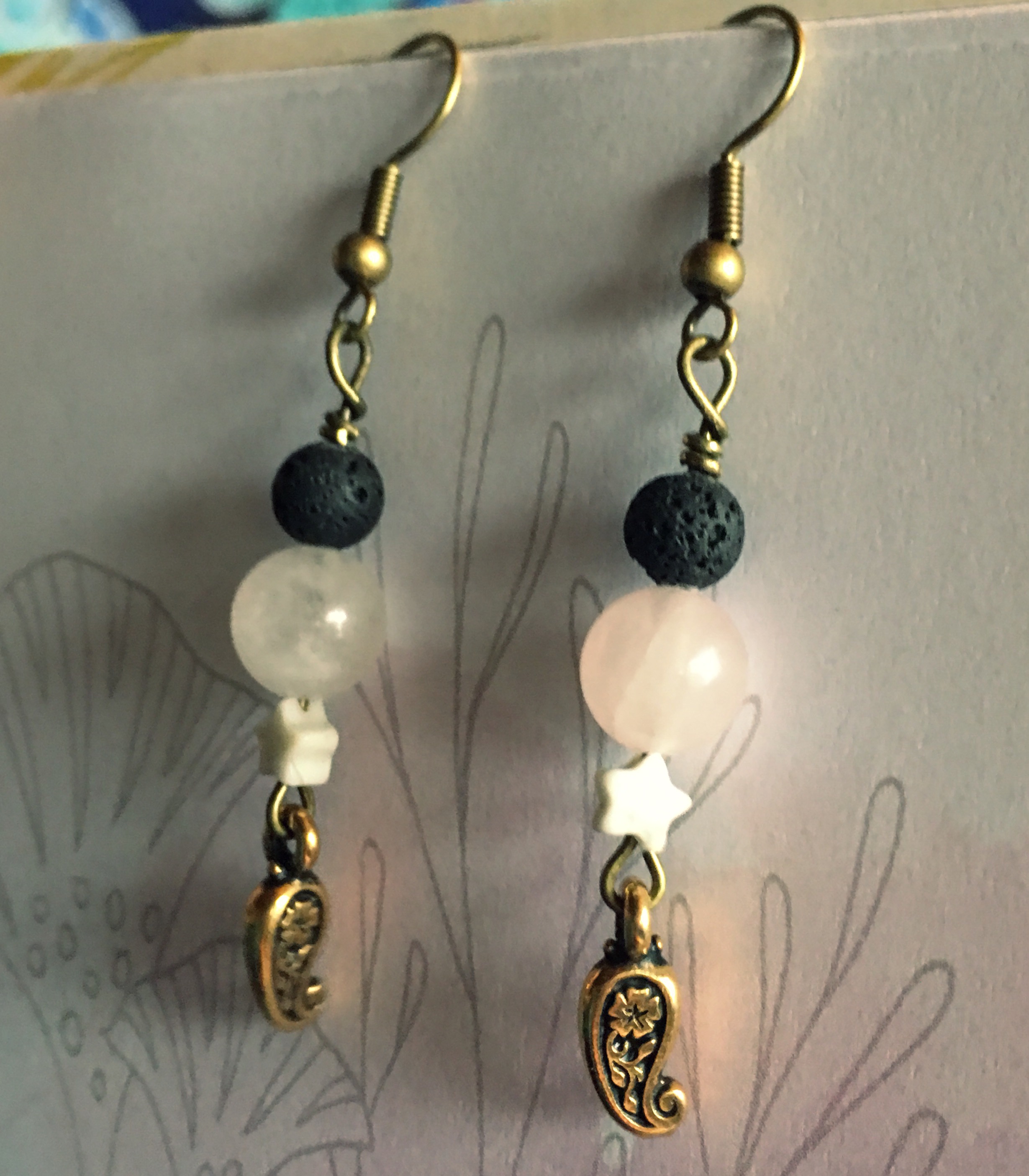 These earrings, with their paisley charms (also called the twisted teardrop), represent life and eternity. Paisley holds rich spiritual meaning and is affiliated with the energy of harvest. Lava, with its many divots, is a calming stone that allows energy to flow. Lava works to keep negativity away and is beneficial for shedding layers of emotional attachment. Lava helps us balance our emotional energy while encouraging us to chase our dreams rather than hide from fears. Lava is perfect during times of change, and can help one figure out which area in life to work on first. Rose Quartz promotes self-love, forgiveness, romance, and worry-free living. Roe Quartz helps with so much, from anger to grief, guilt, stress, phobias, and much more. (See below) Rose Quartz is a wonderful gift, as it can help anyone suffering from childhood trauma - even if they are unaware of it. Many times the symptoms we exhibit are not at all the actual, underlying issue. People tend to bury 'difficult-to-deal-with' feelings. Luckily, Rose Quartz is a very powerful healing stone. Howlite, the star, is included because it helps reduce stress and anger, and lessens the tendency to be boisterous and/or selfish. Howlite helps us communicate ourselves calmly - it is important that we express (and not suppress) our emotions! Let it out so you can Let It Go!