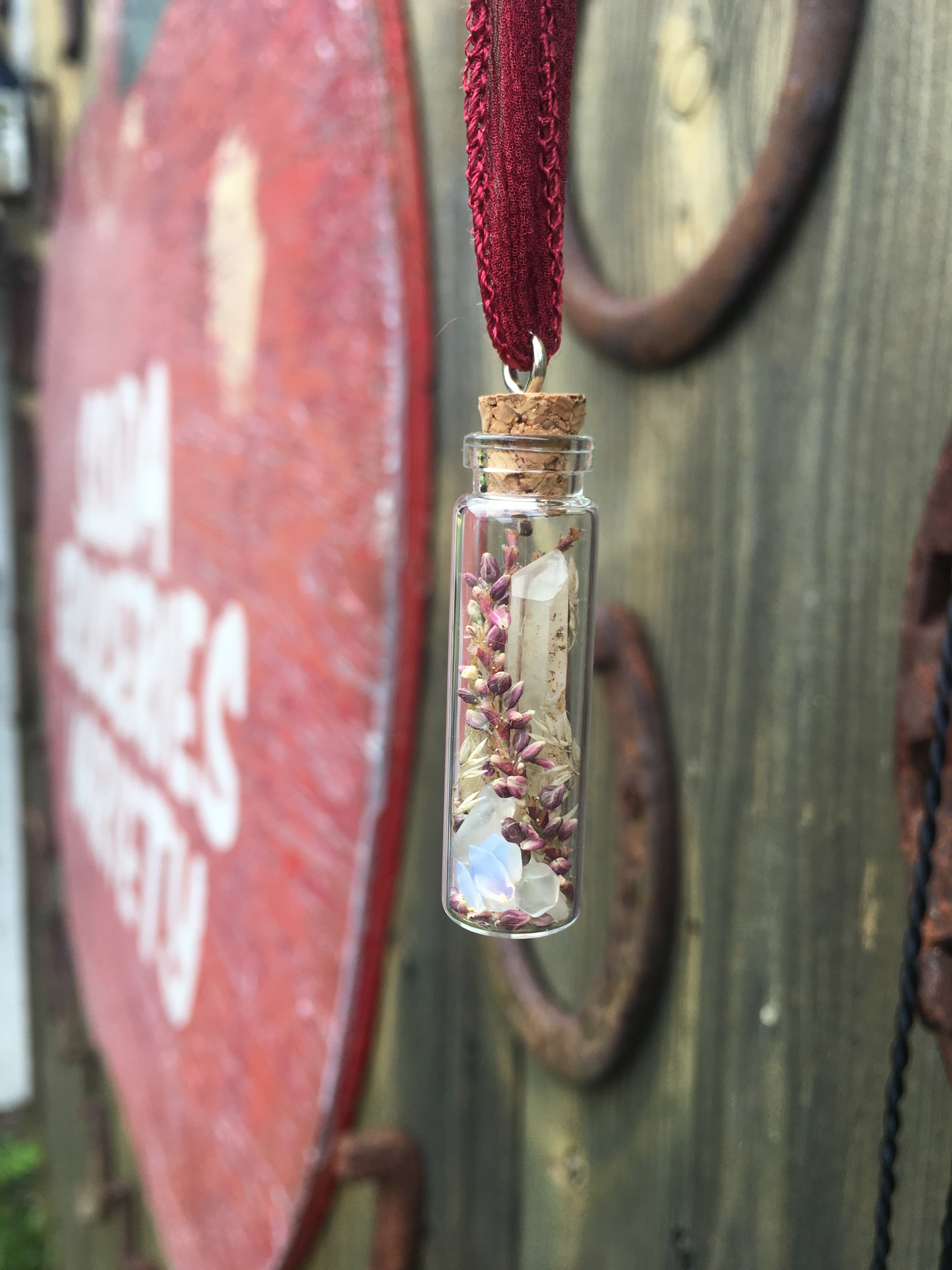 Inside this necklace is Clear Quartz that we hand_dug here in New Hampshire, as well as wildflowers that we personally foraged & dried. There is Opalite in the bottom, which is composed of dolomite plus quartz and fluorite.
